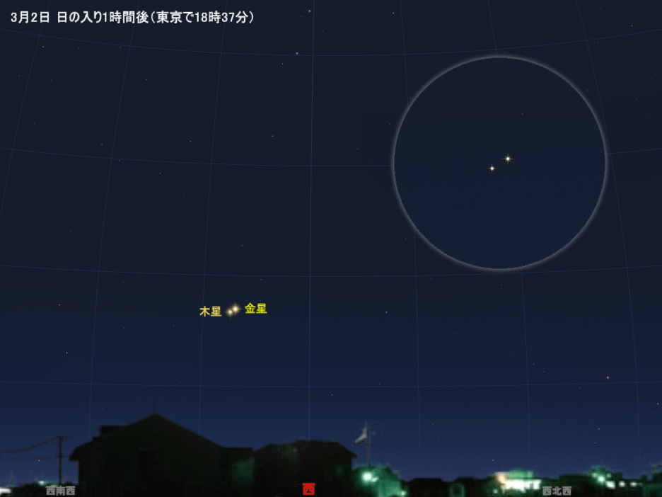 2月末から3月初めにかけて、この金星のすぐ近くにもう一つ明るい星が光っています。こちらは木星です。金星には及ばないものの、木星も明るいのですぐに見つかるはずです。日の入り1時間後くらいになると空が暗くなり、よりはっきりと見えるでしょう。
