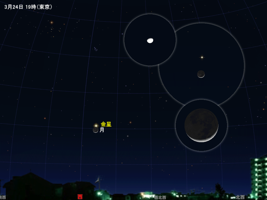 木星との大接近以降も、金星は一番星として夕方の西の空に輝き続けます。そして24日には、この金星のすぐそばに月齢3の細い月(いわゆる「三日月」)がやってきて、非常に美しい共演を見せます。月と明るい星や惑星の接近、あるいは金星と他の惑星との会合など、天体同士が並ぶ現象には様々なパターンがありますが、そのなかで細い月と金星の組み合わせは最も幻想的、印象的なものと言えるでしょう。