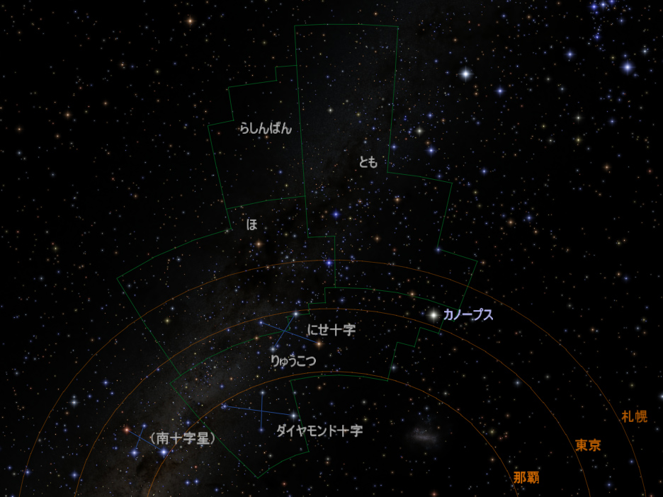 緑の線:各星座の領域(境界線)/オレンジの線:この線より上(北)の星が、札幌・東京・那覇のそれぞれで見られる。札幌では「りゅうこつ座」はまったく見えず、東京ではカノープスがかろうじて見え、那覇では「にせ十字」まで見えるが「ダイヤモンド十字」は見えない