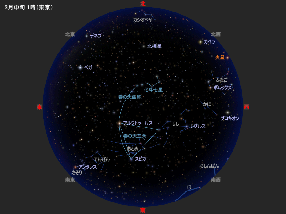 図は3月中旬の深夜1時ごろの星空です。4月中旬の深夜23時ごろ、5月中旬の夜21時ごろにも、この星空と同じ星の配置になります(惑星は少し動きます/月が見えることもあります)。