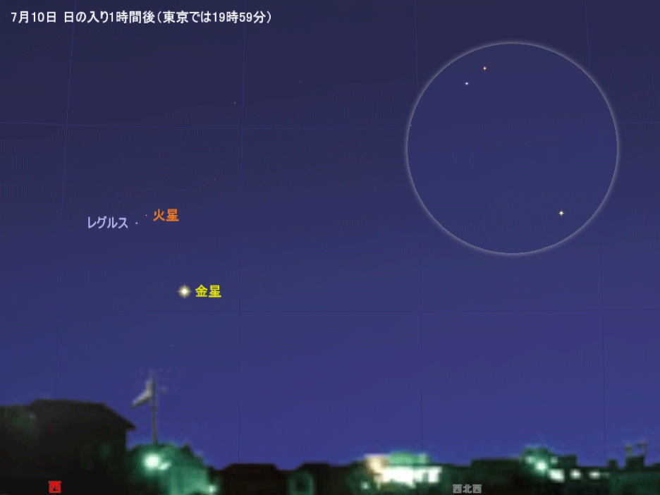 金星も含めてかなり低いので、西の空が地平線付近までよく見渡せる場所で観察することがポイントです。火星とレグルスは空の明るさに負けてしまい見づらいかもしれませんが、「夕空での最後のひと仕事」とばかりに金星が輝いているので、これを目印にすれば火星とレグルスの位置も見当がつけられるはずです。双眼鏡を使うと見やすくなり、とくに6日から16日ごろまでは3天体が双眼鏡の同一視野に見えます。