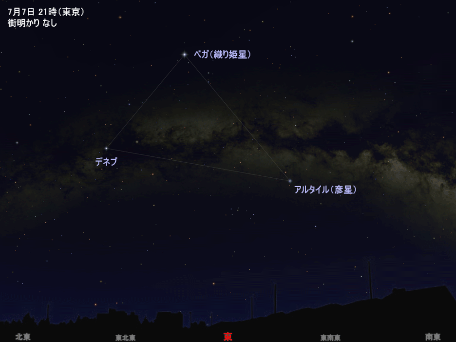 織り姫星ベガと彦星アルタイルが空の高いところに見えます。街明かりや月明かりがなければ、七夕伝説のとおりベガとアルタイルの間を流れる天の川も見えるはずです。見えなくても確かにそこにあるので、想像してみてください。