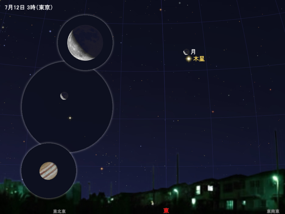 5回のうちでとくに見逃せないのが、12日未明から明け方に起こる月と木星の共演です。木星が明るいことと、天体の間隔が近いことがポイントです。1時ごろから夜明けまでという点でややハードル高めですが、少し夜更かしして、もしくは早起きして観察してみましょう。天体望遠鏡で月と木星をそれぞれ拡大したり、木星の衛星(=木星の「月」)を見たりするのも面白そうです。季節がら、思った以上に早く夜が明け始めるので、明るくなり青みを増してきた空の中でも月のそばに木星が見えるかもしれません。何時ごろまで見つけられるか、ぜひ挑戦してみてください。