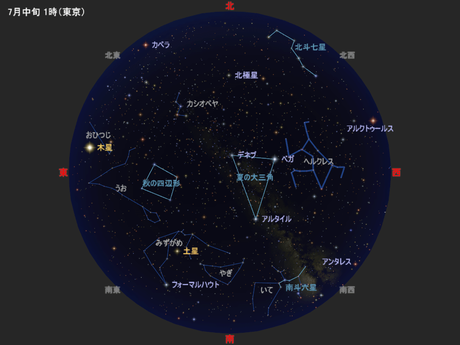 図は7月中旬の深夜1時ごろの星空です。8月中旬の深夜23時ごろ、9月中旬の夜21時ごろにも、この星空と同じ星の配置になります(惑星は少し動きます)。