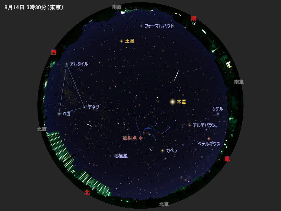 ところで、流れ星はペルセウス座の方向「だけ」でなく、空のあちこちに飛びます。方角も高さもバラバラです。したがって、なるべく広い範囲を眺めることが大切です。見える範囲が限られる双眼鏡や天体望遠鏡は必要ありません。ゆったりとした気持ちで、肉眼で空を見上げてみてください。もし街灯などがある場合は、背を向けるなどして光を直接目に入れないようにすると、眩しさが軽減されて見やすくなります。また、観察を始めてすぐに飛ぶとは限らないので、少し気長に流れ星を待ちましょう。