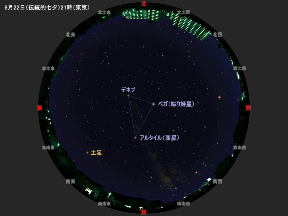7月7日は七夕でしたが、これは古くからの行事なので、旧暦の7月7日に行われることもあります。そこで旧暦7月7日(※)を「伝統的七夕」と呼んで、天文行事として楽しんだり祝ったりすることも広く行われています。伝統的七夕の日は毎年日付が変わり、今年の場合は少し遅めの8月22日です。