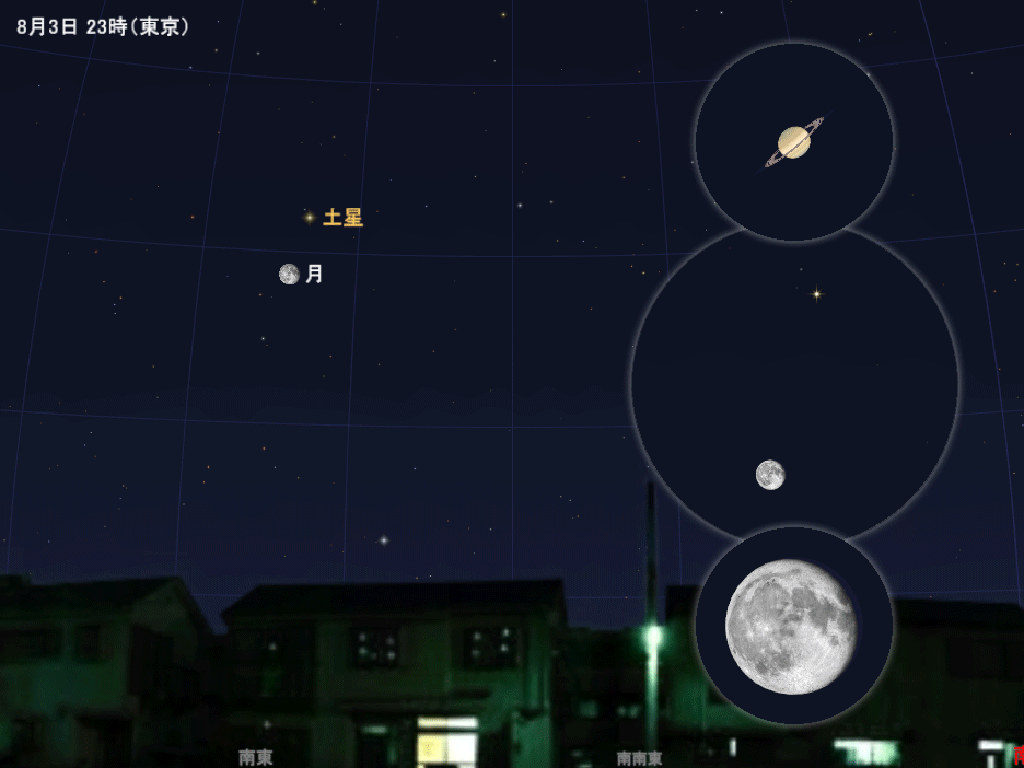 8月3日23時、9日1時、30日21時の、東~南東の空の様子(場所の設定は東京)。大きい円は拡大イメージ(視野6度)、小さい円はさらに拡大したイメージ(正立像、月と惑星で拡大率は異なる)