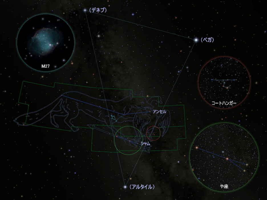 「こぎつね座」「や座」は8月中旬の夜21時ごろに南の空の高いところに見える星座です。小さく暗く、マイナーな存在ですが、それだけに探しがいもあり、見つけられると嬉しい星座です。