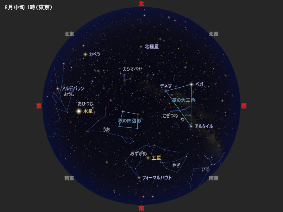 図は8月中旬の深夜1時ごろの星空です。9月中旬の深夜23時ごろ、10月中旬の夜21時ごろにも、この星空と同じ星の配置になります(惑星は少し動きます)。