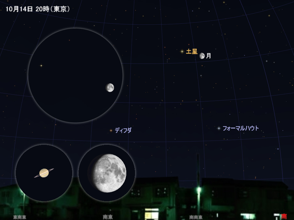 土星は約0.7等級と明るく、街中でも肉眼で簡単に見ることができます。20~21時ごろに南の空に輝く、クリーム色の星を見つけましょう。土星の南(下)には「みなみのうお座」の1等星フォーマルハウトも見えています。明るさは土星と近いですが、フォーマルハウトのほうが低く、色が異なる(白い)ので、区別できるでしょう。14日から15日にかけては、明るい月と土星の共演が見られます。