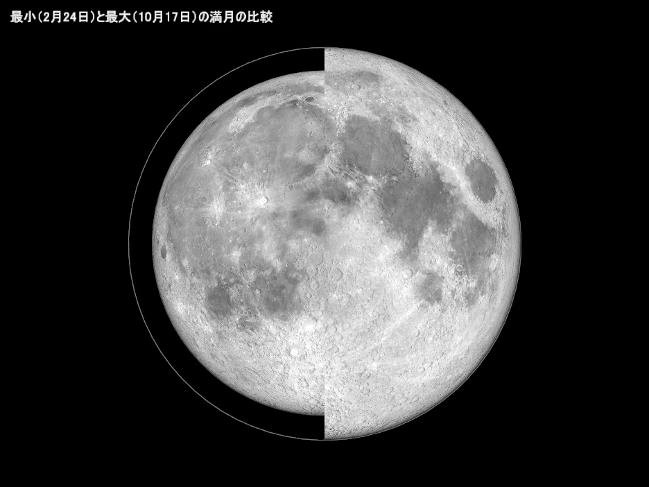 今年最小だった満月(2月24~25日)と比べると、17~18日の満月は直径が約14%、面積では約29%大きくなります(地球の中心から見た大きさで比較)。図を見るとずいぶん差があるように思えますが、実際の空で月を2つ並べて観察することはできないので、その差は実感しにくいものです。