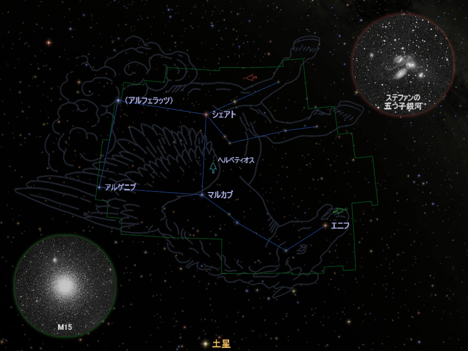 10月中旬の夜21時ごろ、南の空に土星が見えています。この土星から頭の真上へと視線を移していくと、台形に並んだ4つの星が見つかります。「秋の四辺形」や「ペガススの四辺形」と呼ばれるこの台形は、翼が生えた天馬ペガススの胴体にあたり、そこから西(図では右)に伸びる長い首と合わせると「ペガスス座」が描けます。