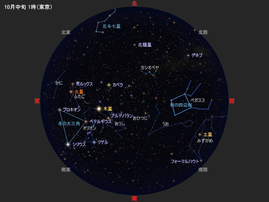 図は10月中旬の深夜1時ごろの星空です。11月中旬の深夜23時ごろ、12月中旬の夜21時ごろにも、この星空と同じ星の配置になります(惑星は少し動きます/月が見えることもあります)。