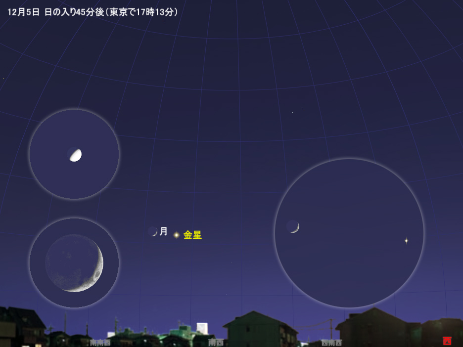 まず1回目は5日の夕方から宵にかけて、南西の空のやや低いところに細い月と宵の明星の金星が並びます。日の入りが早く、暗くなるのも早いので、うっかり見逃してしまわないように気を付けましょう。双眼鏡で観察したり風景と一緒に撮影したりするのもお勧めです。