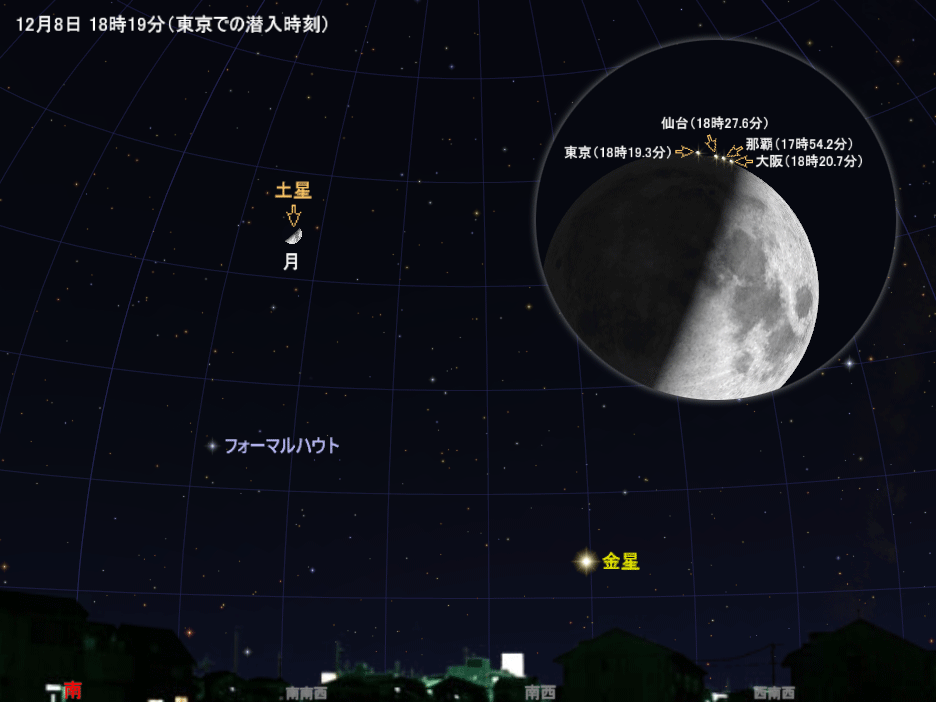 続いて8日、上弦の月と土星が大接近します。このイベントは単なる大接近ではなく、日本の広い範囲で、月が土星を隠す現象(食(しょく)、掩蔽(えんぺい))になります。月の欠け際に近い暗いところから土星が隠されていき、明るい部分から出てきます。食現象をじっくり観察するには天体望遠鏡が必要ですが、肉眼や双眼鏡で見ていても、土星の光がゆっくりと消えたり現れたりする様子が見られるかもしれません。望遠鏡なら拡大して見えるので、とても面白い眺めになります。