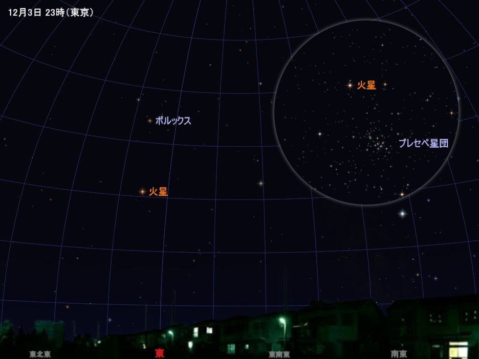 最接近は3~4日ごろですが、12月中はずっと双眼鏡の同一視野内で見えるくらいの間隔です。火星に双眼鏡を向ければ、その近くに星団の星々も見えるでしょう。明るい火星が大人しい星団の星々に寄り添うという、美しく面白い光景です。継続的に観察すると、星団に対する火星の位置が変わっていく様子もわかります。長期的にお楽しみください。