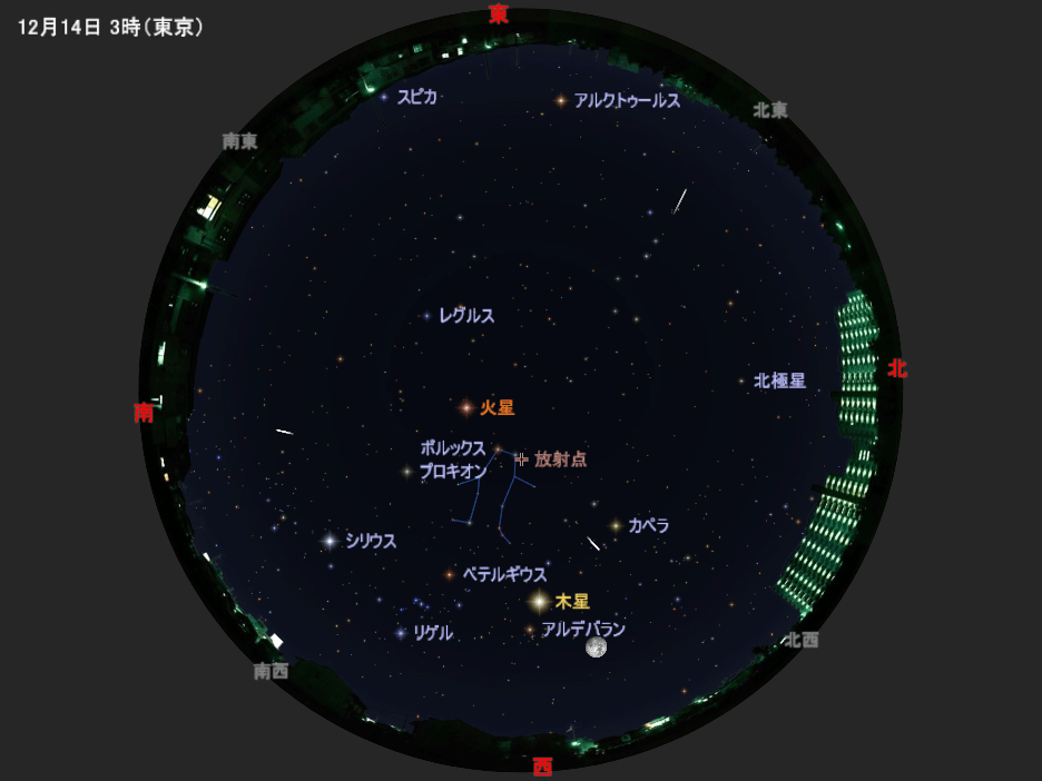 今年のピークは14日の朝10時ごろと予想されています。これは夜明け後なので、実際に見やすいのは14日の未明から明け方にかけての時間帯になります。「ふたご座」を中心として空のあちこちに流れ星が飛ぶので、空を広く見渡しましょう。月明かりの影響が大きいため、目にできる流星数は少なくなってしまいそうですが、月に背を向けるなどして離れた方向を中心に眺めると、多少は見やすくなります。寒さ対策を念入りにして、暖かい飲み物なども準備して、流れ星を待ってみてください。