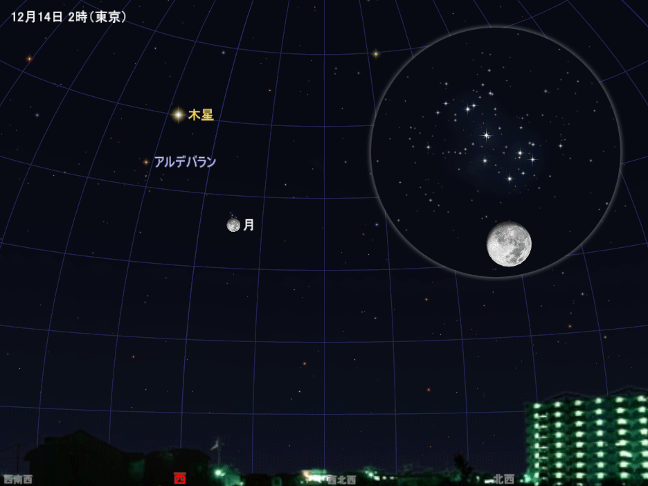 | 14日(土) | 3時~5時ごろ、プレアデス星団食(星団の星々が月に隠されます。「今月の星さがし」で解説) ふたご座流星群の活動がピーク(「今月の星さがし」で解説) 宵~翌15日明け方、月と木星が並ぶ |