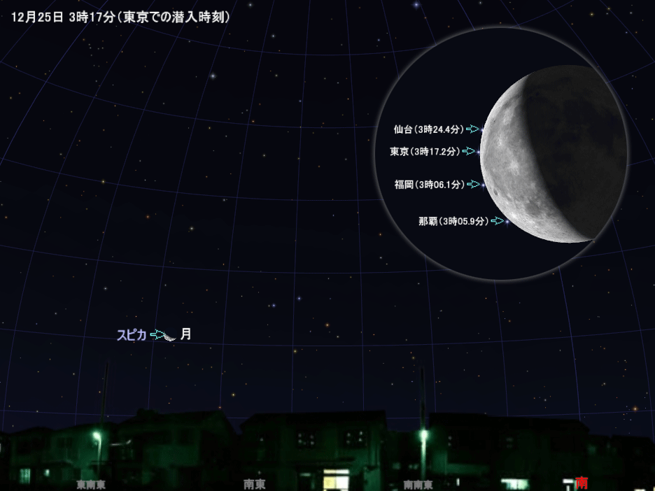 スピカが月に隠されるときは明るい縁での現象なのでやや見づらく、月から出てくるときは急に現れるのでタイミングが難しいと、少し注意が必要な現象ですが、それでも楽しみなイベントで見逃せません。南東方向に高い建物などがない場所で、双眼鏡や天体望遠鏡を使って観察しましょう。