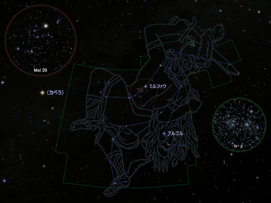 星図に見やすい散開星団を示しました。Mel 20(メロッテカタログの20番)はミルファクのあたりを、二重星団h-χ(エイチ・カイ、2つの散開星団が並んでいます)はミルファクの北西あたりを、それぞれ探してみましょう。いずれも双眼鏡で楽しむことができ、二重星団は低倍率の天体望遠鏡でも見ごたえがあります。星々の明るさや色、数、広がり具合といった個性にも注目してみてください。