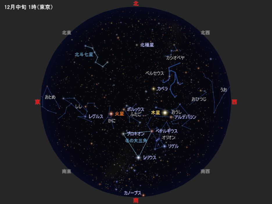 図は12月中旬の深夜1時ごろの星空です。来年1月中旬の深夜23時ごろ、2月中旬の夜21時ごろにも、この星空と同じ星の配置になります(惑星は少し動きます/月が見えることもあります)。