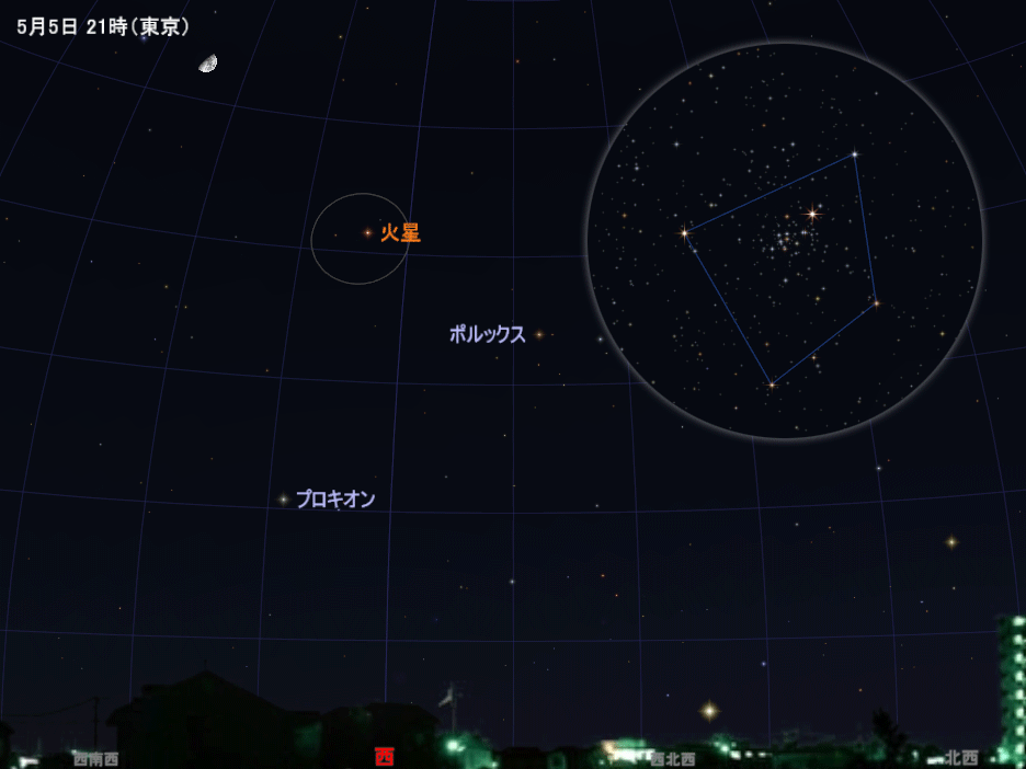 上弦(日没ごろに南の空に見え、夜半ごろ西の空に沈む) 夕方~深夜、月と火星、プレセペ星団が並ぶ |