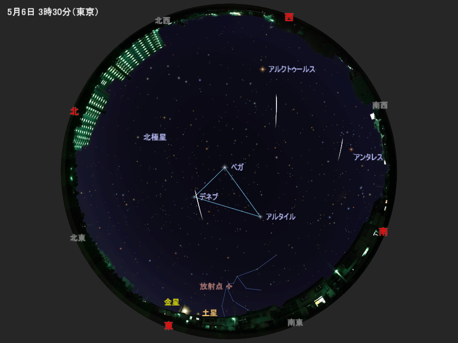 みずがめ座η(エータ、イータ)流星群は、毎年ゴールデンウィークの終盤に活動がピークとなる流星群です。「みずがめ座」のη星付近を中心として四方八方に流れ星が飛ぶように見えることから、このような名前で呼ばれています。