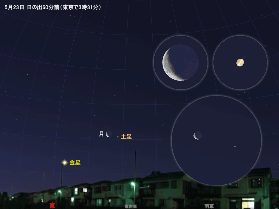天体望遠鏡で観察すると、金星が半月状に見えること、土星の環がほとんど見えないことなどもわかるかもしれません。明け方という時間帯や低空という条件のため、望遠鏡での観察はやや難しいのですが、お持ちであれば挑戦してみてはいかがでしょうか。