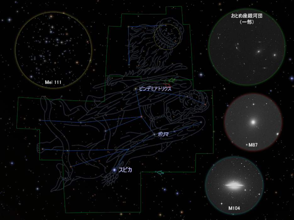 「おとめ座」と「かみのけ座」の境界あたりには銀河が多数集まっています。星がたくさん集まった天体を「星団」と呼ぶのと同様に、銀河の集団は「銀河団」と呼び、この「おとめ座銀河団」の場合には銀河が1000個近くも含まれています。