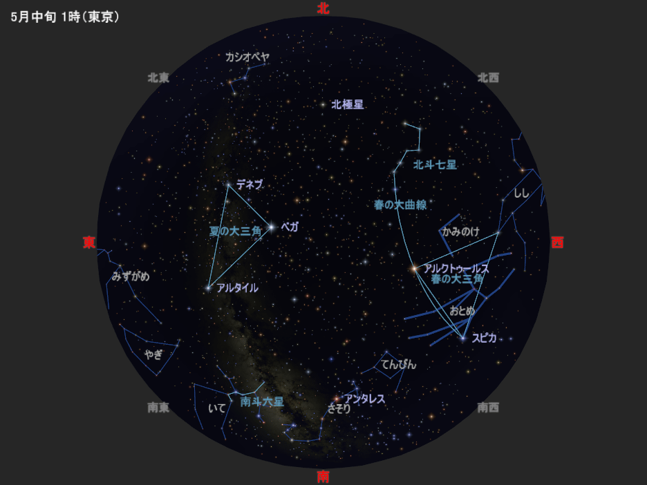 図は5月中旬の深夜1時ごろの星空です。6月中旬の深夜23時ごろ、7月中旬の夜21時ごろにも、この星空と同じ星の配置になります(月が見えることもあります)。