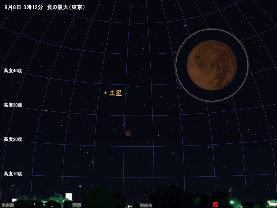 月が欠け始める(部分食の始まり)のは1時27分ごろで、南西の空に見える満月の上のほうが暗くなっていきます。その後、月は高度を下げながら大きく欠けていき、2時31分ごろに月全体が地球の影に入ってしまう「皆既食」の状態になります。