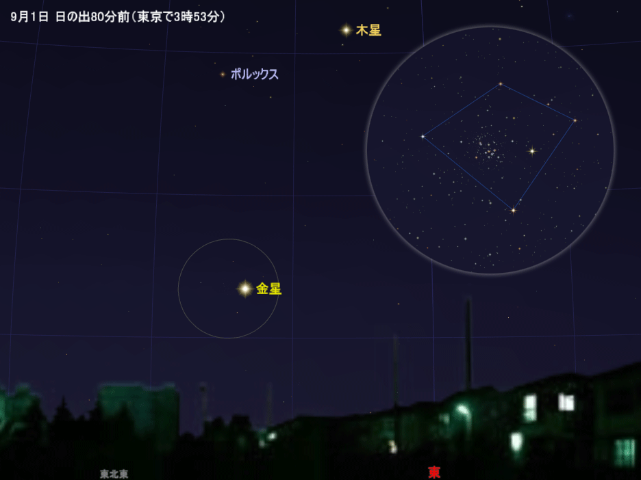 日の出1時間前(東京で4時20分ごろ)の高度は約15度で低めですが、とても明るいので簡単に見つかります。建物などに隠されない場所で観察しましょう。