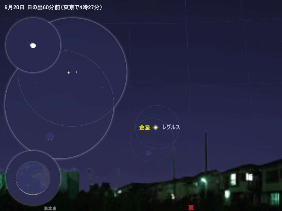 9月16日から24日まで2日ごとの、日の出60分前の東の空の様子(場所の設定は東京)。大きい円は拡大イメージ(視野7度)、20日の小さい円はさらに拡大のイメージ(正立像、月と金星で拡大率は異なる)