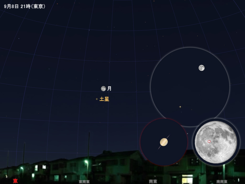 9月8日 夜21時の東の空の様子(場所の設定は東京)。接近の様子は一晩中見られるが、時間によって方位や高さは変化する。大きい円は拡大イメージ(視野7度)、小さい円はさらに拡大のイメージ(正立像)で、月の拡大像の中にある赤い円の大きさが、土星の拡大像の円と同じ