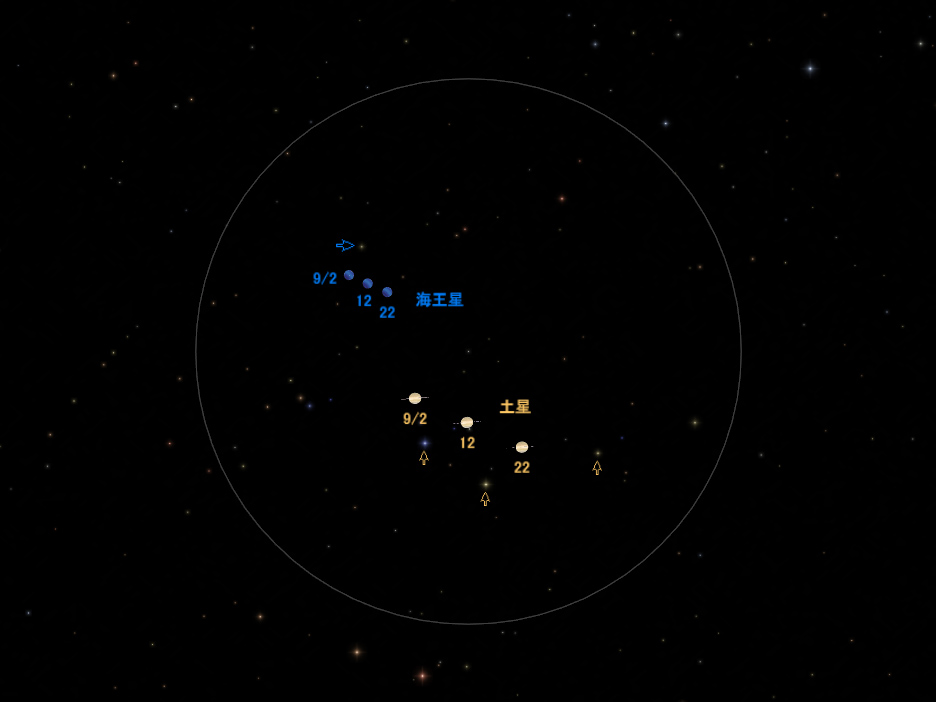9月の、背景の恒星に対する土星と海王星の位置。惑星はわかりやすいように拡大像で表示している。円の大きさは7度