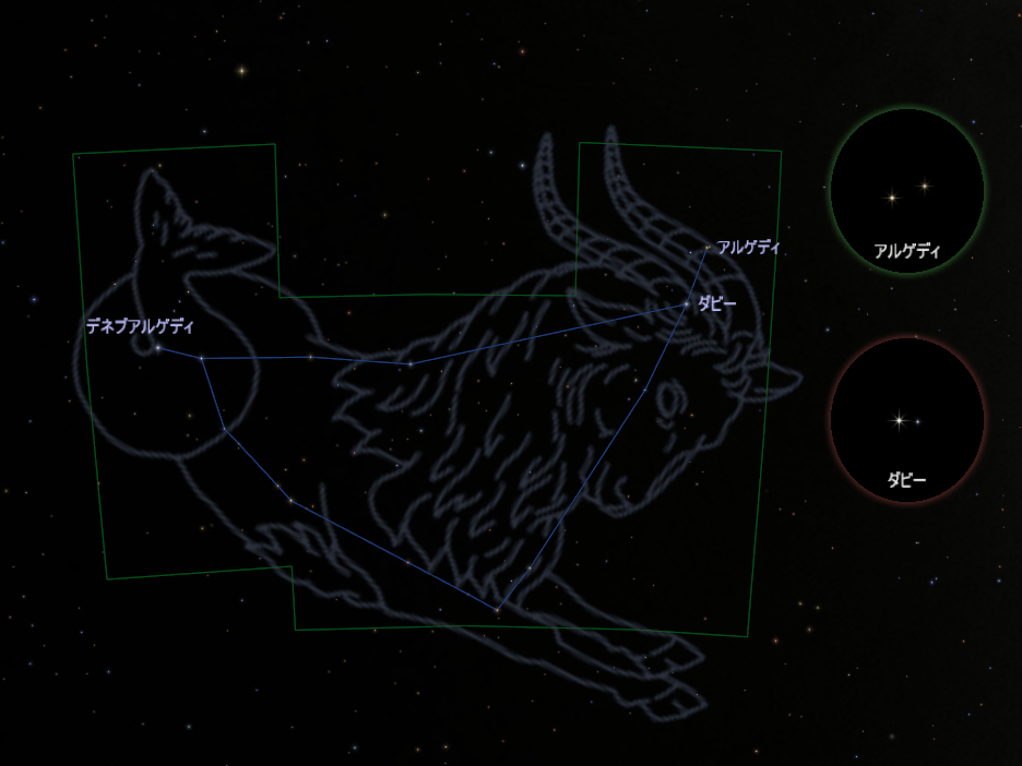 α(アルファ)星の「アルゲディ」は、黄色い4等星が並んでいます。双眼鏡を使えば街中でも簡単に2つに分かれて見えます。