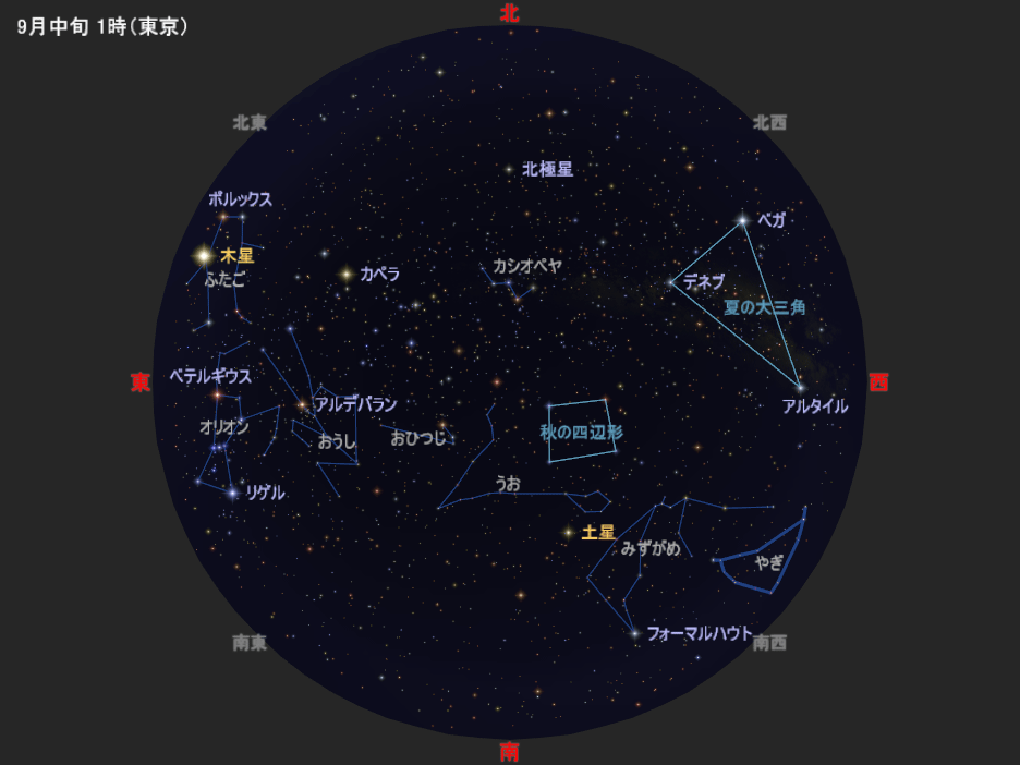 図は9月中旬の深夜1時ごろの星空です。10月中旬の深夜23時ごろ、11月中旬の夜21時ごろにも、この星空と同じ星の配置になります(惑星は少し動きます/月が見えることもあります)。