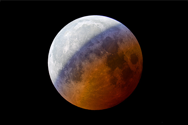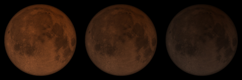 一番の注目点は、皆既中の月の色や明るさがどのようになるかということでしょう。皆既中の月は「赤銅色(しゃくどういろ)」と表現される赤っぽい色に見えますが、これは地球の大気で屈折した太陽の光が月を照らすときに、波長の長い光=赤い光のほうが月まで届きやすく、短い波長の光=青い光は届きにくいためです。このときの大気の状態によって、皆既中の月がオレンジ色のように明るくなったり、焦げ茶色のように暗くなったりします。今回の月食ではどのように見えるか確かめてみましょう。