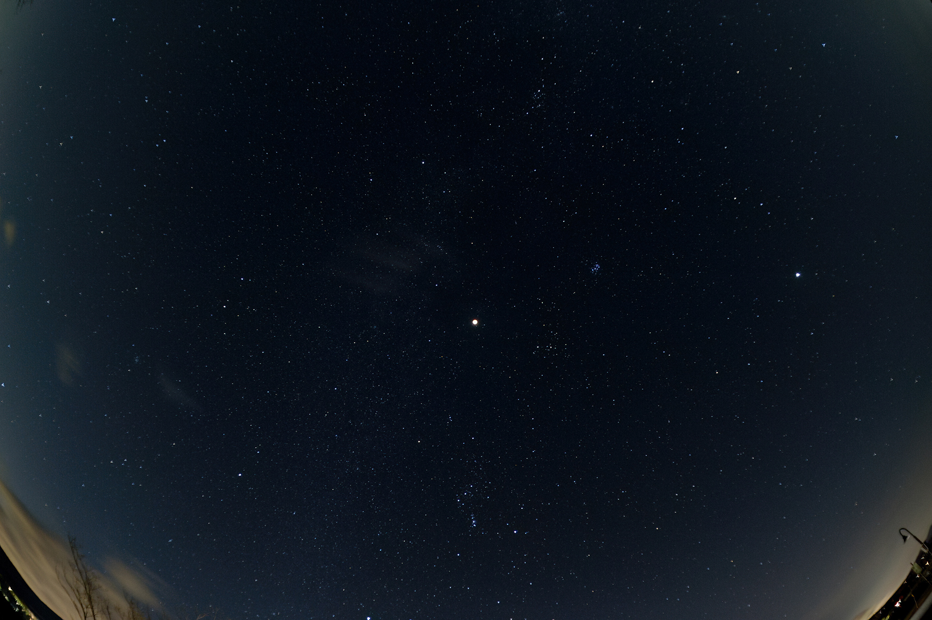 丸い月と暗い星空を一緒に撮影できるのは、皆既食中の月が暗くなったときが唯一のチャンスです。この画像は、2011年12月10日の皆既月食の際に、魚眼レンズを用いてオリオン座やおうし座からペルセウス座まで広く入れて撮影したものです。暗い星まで写そうと露出時間を長くしたために月が白くなってしまいましたが、ややアンダー気味にして赤く見せても良かったかもしれません。