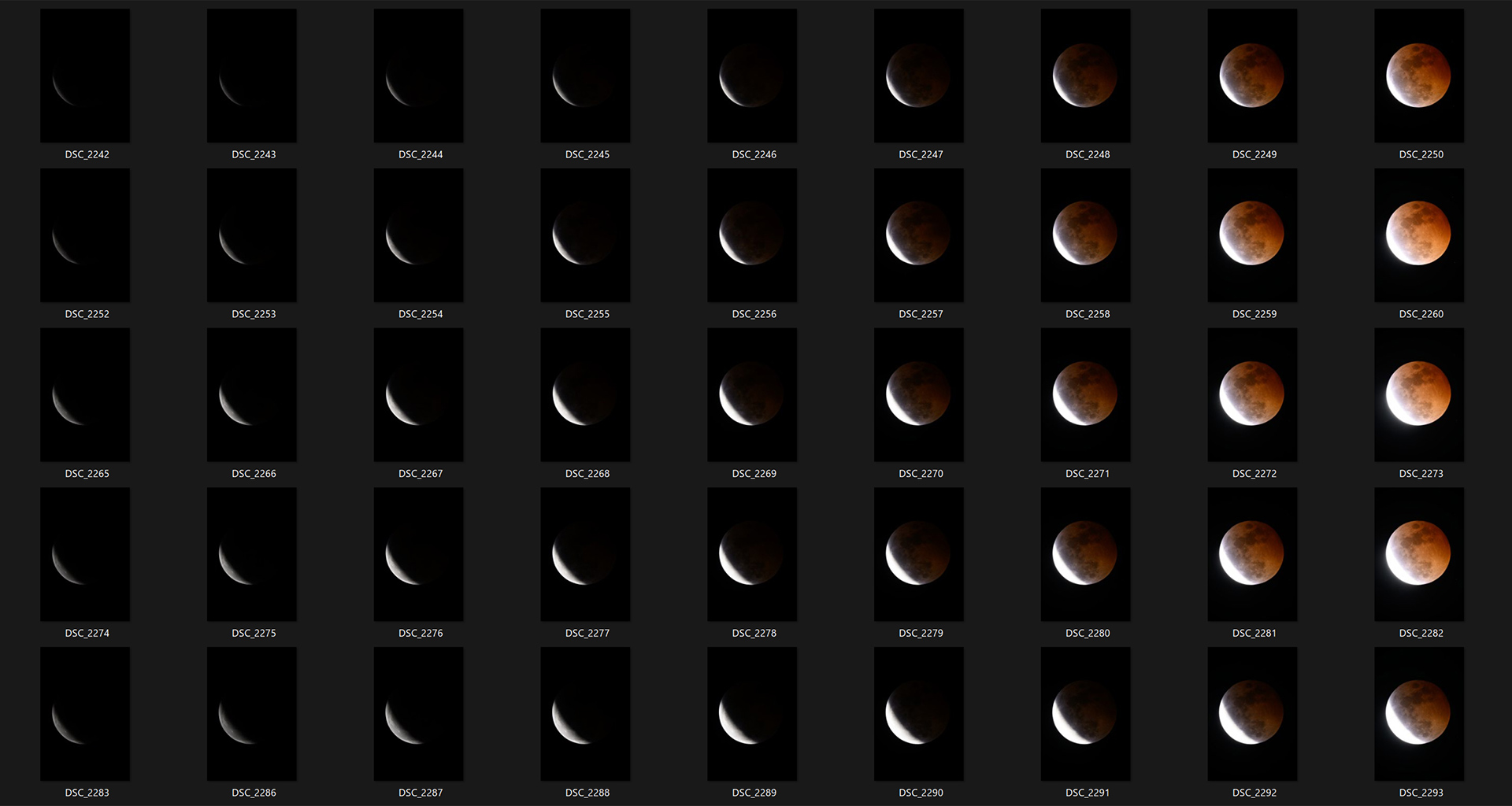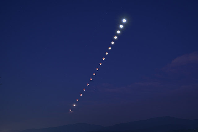 月食が始まってから終わるまでの間に起こる、月の形の変化をまるごと記録しようという撮影です。一定の撮影間隔で撮影しておくと、月が空を移動しながら形を変えていく様子を見せることができます。合成して月食全体の経過を説明できるような画像を作るほか、スライドショーやタイムラプス動画にして楽しむこともできます。