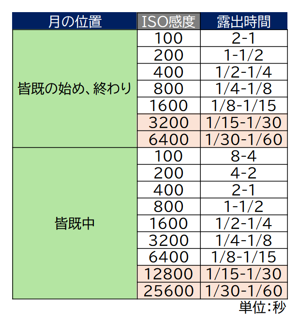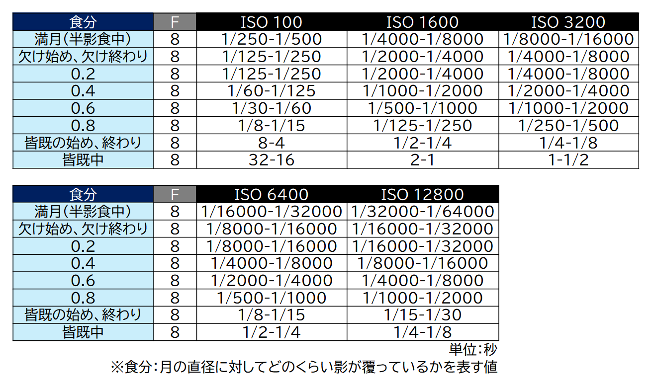 月食は、欠け始めから皆既、皆既から欠け終わりまでの明るさ(輝度)の変化が大きく、露出段数にして13段ほどあります。適正露出もその時々でどんどん変化しますので、下記の表を参考にしながら自分の撮影システムに合わせて設定してください。