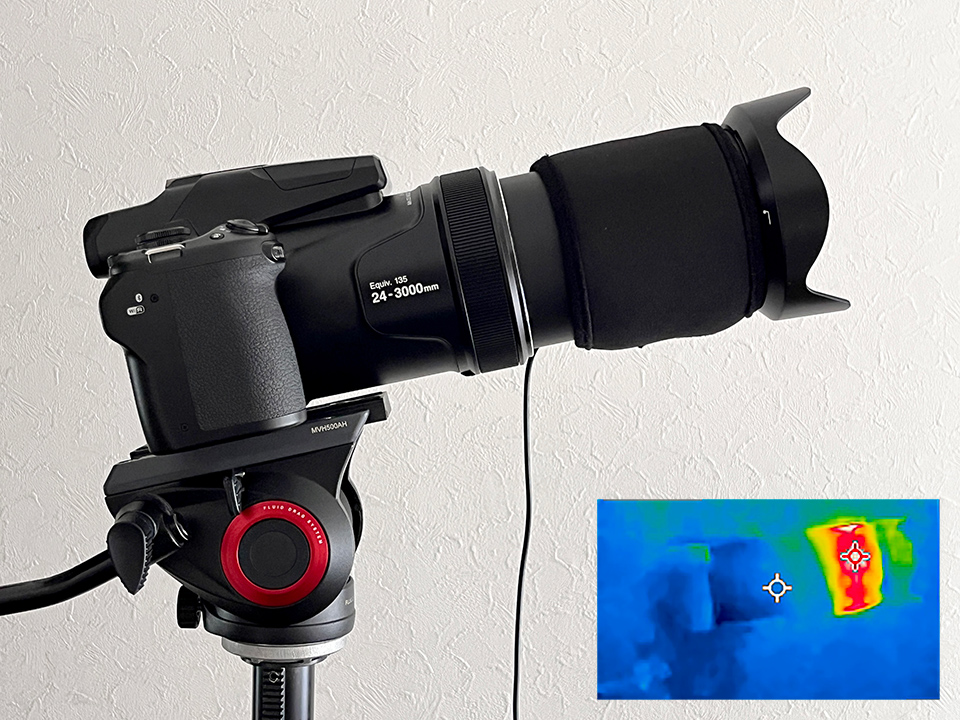 レンズ先端付近に、結露防止のため市販のヒーター(モバイルバッテリー使用)を巻いた様子。右下はサーモグラフィー画像。