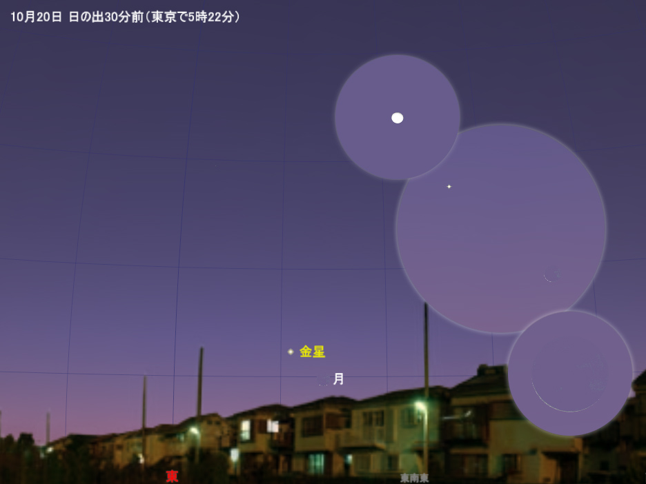 日の出30分前(15日の場合、東京で5時15分ごろ)の高度は約15度と低めですが、とても明るいので、建物などに隠されていなければ肉眼でも簡単に見つかります。早起きして、見晴らしの良い場所で観察しましょう。11月以降はいっそう低くなるので、今月のうちに見ておきたいところです。
