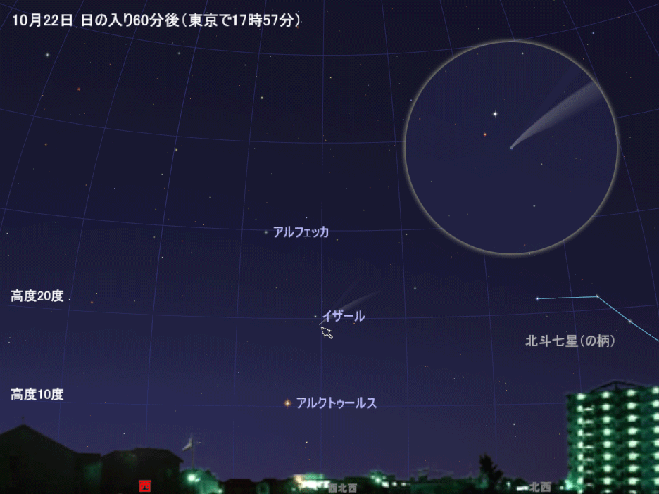 10月18日から30日まで2日ごとの、日の入り60分後の西~北西の空の様子(場所の設定は東京)。彗星は見やすいように強調して描画してあり、これほど明るく尾が長く見えるとは限らない。囲み内は双眼鏡で見たイメージ(視野6度)