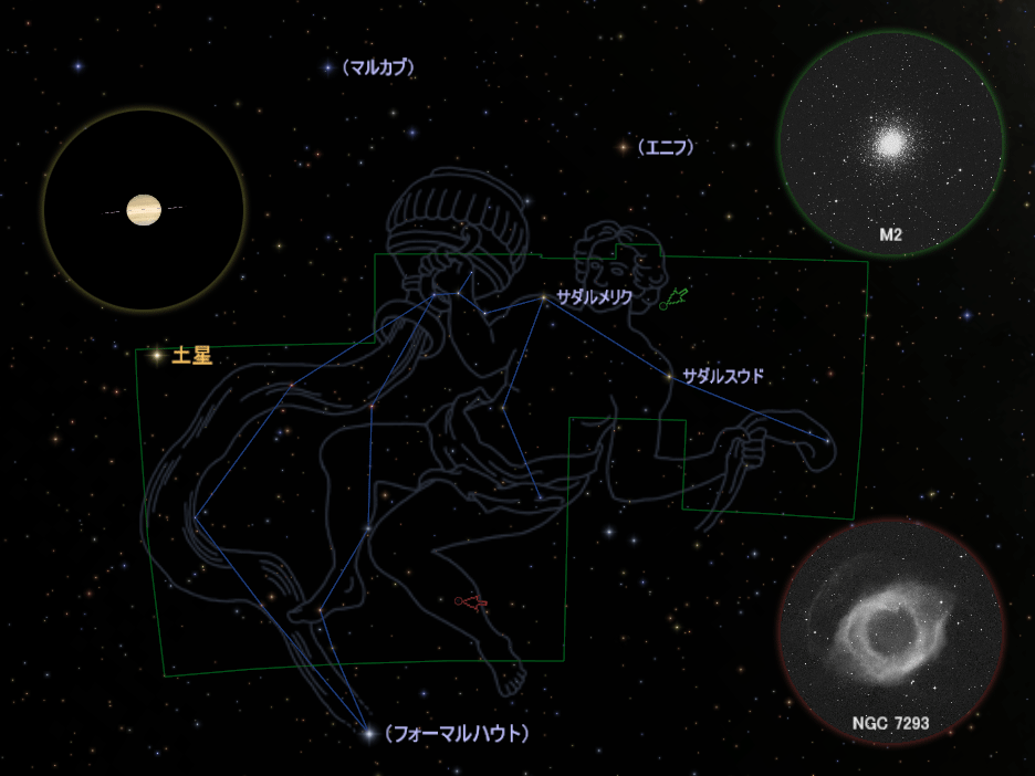 サダルスウドの少し上(北)に、多くの星がボール状に集まっている球状星団のM2があります(Mはカタログの略号です)。空が暗いところであれば、双眼鏡でも少しにじんだ感じに見え、普通の恒星とは違うことがわかります。天体望遠鏡で観察すると星の大集団であることを感じられるでしょう。