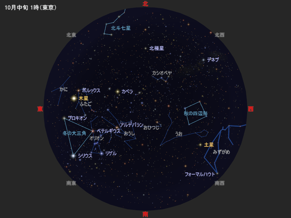 図は10月中旬の深夜1時ごろの星空です。11月中旬の深夜23時ごろ、12月中旬の夜21時ごろにも、この星空と同じ星の配置になります(惑星は少し動きます/月が見えることもあります)。