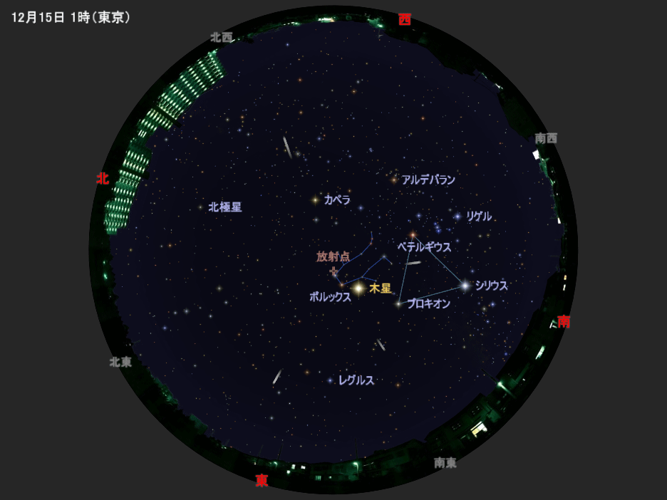 今年のピークは14日の夕方17時ごろと予想されているので、14日の宵から15日明け方が最も期待できる時間帯になります。15日の2時ごろに細めの月が昇ってきますが、月明かりの影響はそれほど大きくありません。街明かりがなく見晴らしが良い場所なら、1時間あたり20~25個ほど見えるでしょう(不慣れな場所での観察は避けましょう)。ふたご座流星群の流れ星は明るいものも多いので、多少の街明かりがあるような場所でも1時間に5~10個は見られそうです。