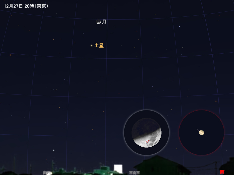 27日の夕方から宵、上弦の半月(月齢7)と並びます。