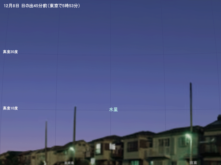 明け方の東南東の低空に見えます。日の出45分前(15日の場合、東京で6時ごろ)の高度は約8度で、水星としては好条件です。とはいえ低いことは確かなので、低空まで見晴らしの良い場所で探しましょう。「今月の星さがし」の星図や解説も参考にしてください。