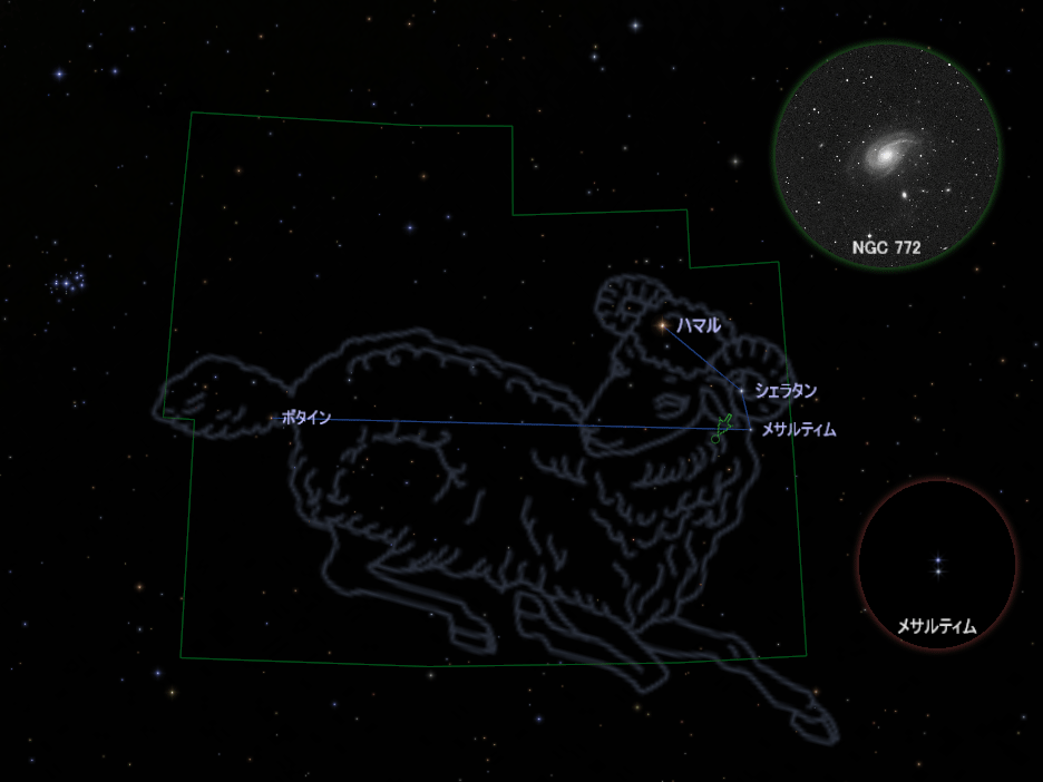 羊の顔のあたりに位置する渦巻銀河NGC 772(NGCはカタログの符号です)は腕の見え方が非対称で、北(画像の上)のほうが長く明るく見えます。他の銀河と接近して、重力の影響でこのような形になったと考えられています。やや暗く、望遠鏡を使っても観察は難しいので、インターネットの画像で楽しみましょう。